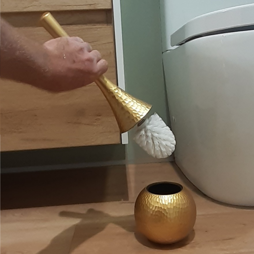 Not metal, sure looks like it, this luxe toilet brush set. Designed to impress, built to clean—and stay clean, because even the essentials should feel elegant.